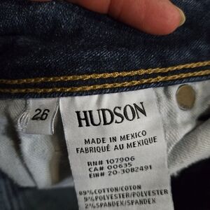Hudson Jeans skinny silhouette in dark wash denim. Subtle whiskering and light distressing at thighs. Stretch fabric for a fitted look. Classic five-pocket styling.