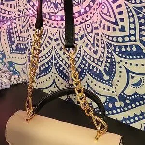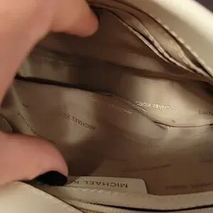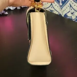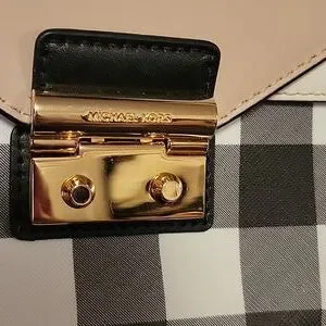 Structured Michael Kors crossbody satchel. black top handle. Cream and black checkered front panel with gold-tone hardware. Removable strap and secure push-lock closure. Polished look for day or evening.
