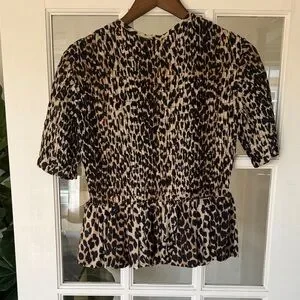 Ganni short sleeve peplum top with leopard print. Fitted smocked bodice and flared hem. Lightweight, textured fabric. Stylish for casual or dressed-up looks.