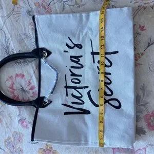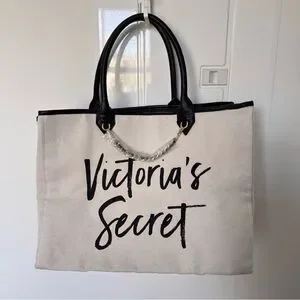 Victoria's Secret canvas tote with bold black script logo. Black handles with a decorative chain detail. Neutral cream body ideal for daily use. Simple, chic style that complements many outfits.