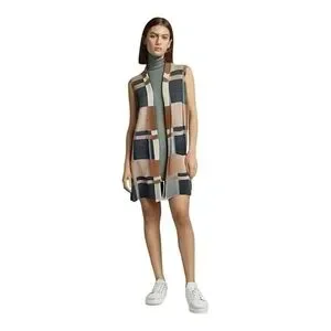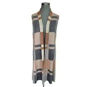 Upgrade your wardrobe with the Women's 1775 Long Plaid Vest Cardigan, a chic open-front piece that adds sophisticated layering to any ensemble. Size M measuring 37.5" in length for flattering elongated silhouette, crafted from soft blend of 53% rayon and 47% acrylic ensuring comfortable wear with quality drape. The sleeveless knit design in versatile tan, blue, and white plaid pattern works beautifully for layering over shirts, blouses, dresses, or casual tees across seasons. Perfect for adding warmth and charm to brunch outings, casual gatherings, office wear, or special occasions where effortless style meets practicality. The long vest silhouette creates vertical lines that flatter various body types while the open front allows easy styling versatility. In excellent condition and ready to become a fashion staple, this duster-length cardigan combines autumn-winter coziness with year-round wearability.