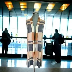 1775 long vest, plaid cardigan vest, sleeveless long cardigan, tan blue white vest, open front duster, size m vest cardigan, rayon acrylic knit, 37.5 inch vest, layering cardigan, autumn vest, versatile long vest, women's plaid duster, casual vest cardigan, sleeveless blazer vest, flattering long vest