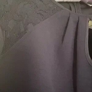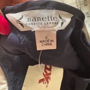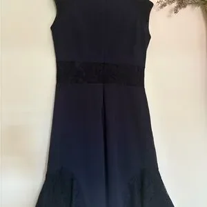 Beautiful navy blue career dress by Nanette Lepore, brand new with original tags attached. This elegant piece features delicate tonal lace panels at the waist and hem, creating a flattering and feminine silhouette. The keyhole neckline and tailored shape make it perfect for professional settings, business events, or evening dinners.