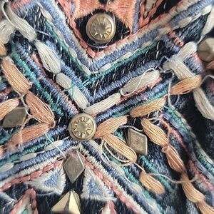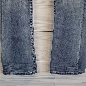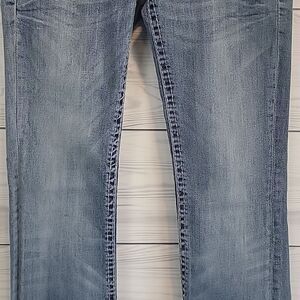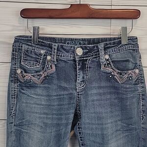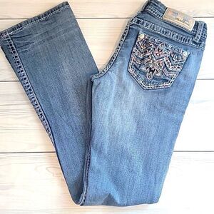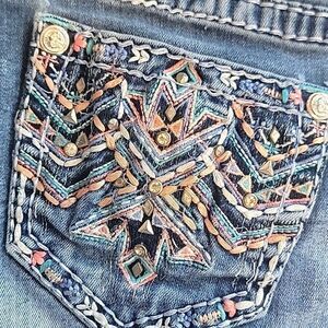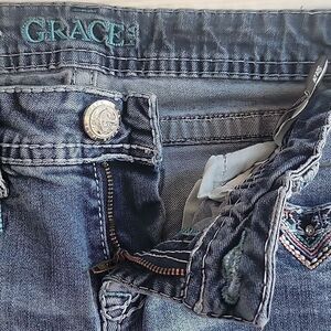 Classic 5 pocket styling lightwash blue denim jeans by Grace with colorful embroidered pockets, bootcut leg, and manufacture distressing, including fading and whiskering. Great pre-owned condition with normal signs of wash and wear.