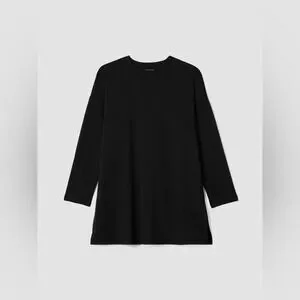 This Eileen Fisher tunic top features a relaxed, oversized silhouette with a classic crew neckline. Crafted from a soft, high-quality knit fabric, it includes side slits for ease of movement and a comfortable, draped fit. This piece is in new condition with original tags attached, ensuring it is ready for immediate wear. It is a versatile staple for layering or wearing on its own during casual outings, office days, or travel.