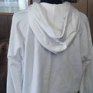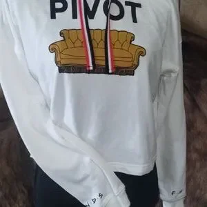 FRIENDS series cream hoodie with PIVOT sofa image. Features branding and lined hood. Like new. Soft and lightweight.