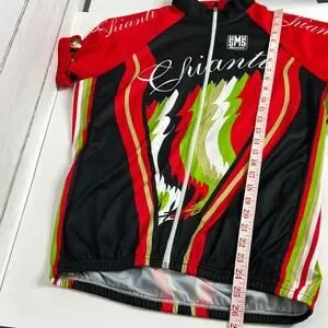 Santini SMS short sleeve cycling jersey in size XXL. This performance cycling top features a bold red, black, green, and white graphic design with rooster accents and “Chianti” script across the front and sleeves, giving it a distinctive Italian cycling aesthetic.
