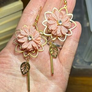 Delicate Dusty rose fabric flower earrings with gold-tone metal accents. Sparkling center crystal and dangling gold leaf and bar for elegant movement. Lightweight, feminine design perfect for everyday wear or special occasions.