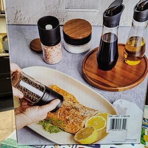 new, 6-piece Seasoning Station in black with wood accents. Stylish countertop set for salt, pepper, oil and spices. Durable design with easy-to-use dispensers. Adds organized, modern storage to your kitchen.