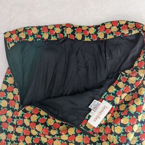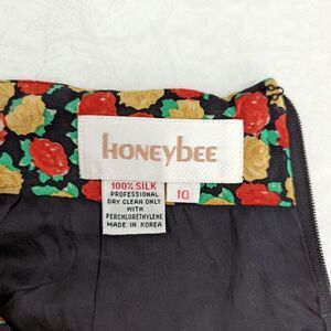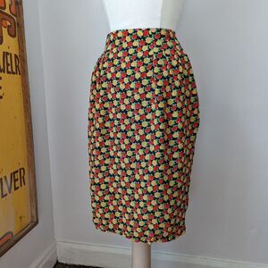 Vintage silk floral pencil skirt. Red and yellow gold roses on a black background. By Honeybee. 100% silk. Made in Korea. Marked a size 10- 28" waist, 39" hips, 26" long. In great vintage condition.