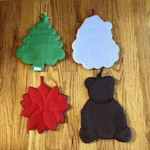 Set of four holiday-themed hot pads / pot holders featuring festive shapes: bear, Christmas tree, poinsettia flower, and a cloud or character-shaped design. Made with quilted fabric construction suitable for protecting countertops and surfaces from heat. Perfect for seasonal kitchen use, holiday cooking, or Christmas decor displays. Great addition to a farmhouse, cozy, or traditional holiday kitchen.