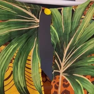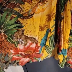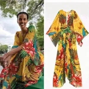 Get ready to embark on a wild and adventurous journey with this stunning Farm Rio Tropical Dreams Caftan Maxi Dress. The vibrant yellow, red, blue and green colors and tropical cheetah print will make you stand out in any crowd. This dress is perfect for women who love to make a statement and feel comfortable while doing it.