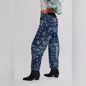 NWT Free People Good Luck Printed Barrel Jeans - navy bandana