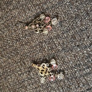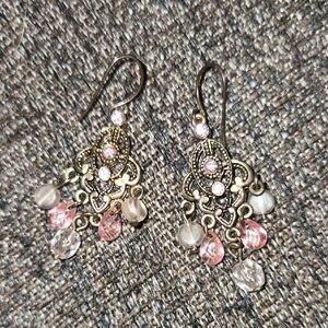 Elegant unbranded chandelier earrings with pink crystal accents. Antique gold-tone filigree adds classic detail. Light-catching pink and clear drops create feminine movement. Perfect for dressy or everyday wear.
