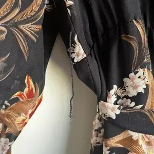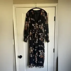 Elegant dress with floral pattern. Features long sleeves and a tie waist.