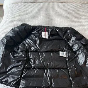 Only wear is on inside label, Moncler emblem, and small strings at bottom of zipper.