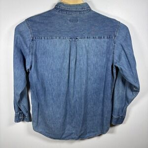 Cherokee Brand long sleeve denim button down shirt crafted from 100% cotton in a classic medium wash. This rugged yet versatile piece features a button-down collar, a single chest pocket, and a back box pleat for added comfort and range of motion. The durable denim fabric shows natural fading and character, perfect for a casual or workwear-inspired look. Note some minor fraying/wear near the underarm area as shown in photos.