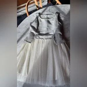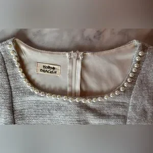 Beautiful feminine dress by Holly Bracken. The textured tweed bodice is finished with delicate pearl trim along the neckline, paired with a soft layered tulle skirt that creates a light, romantic silhouette.