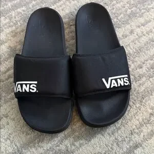 Vans slide sandals with a bold logo on the strap. Cushioned footbed for easy wear. Simple slip-on design for casual use.