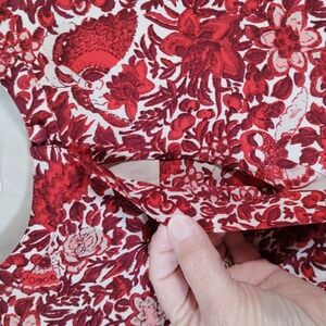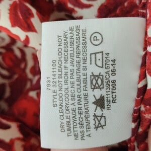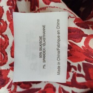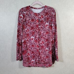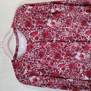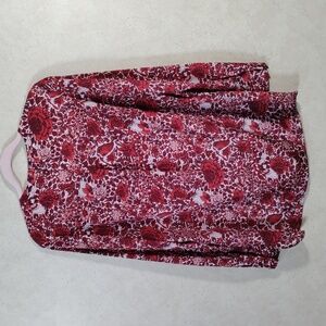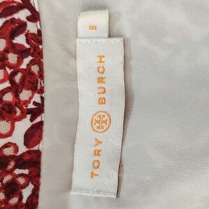 Tory Burch red and burgundy floral long sleeve silk blouse, size 8. In very good pre-owned condition. Pullover style with a button that secures the round neck. Longer length with a pleat down the center front. Long cuffed sleeves with a rounded slightly high low hem. Underarm to underarm 40" around, sleeves 24.5", length 28.5" in the front and 30.5" in the back. Item number 10256-577-400.