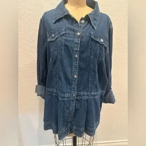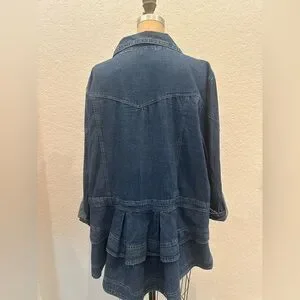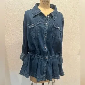 Classic denim jacket by Nostalgia. Features an adjustable drawstring waist with ruffle peplum that is longer in the back. Feminine take on a lightweight denim layering piece.