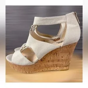 Karl Lagerfeld Sylvie Beige Canvas Cork Wedge Sandals 8M Gold Zip Back