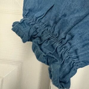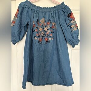 Charming denim blouse in a beautiful blue with intricate floral embroidery. Perfect for any occasion. Can be worn off shoulder. See material tagSize Medium #309-K