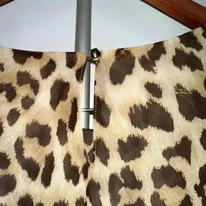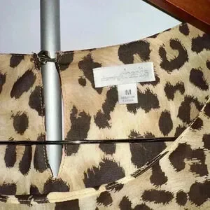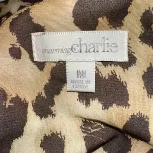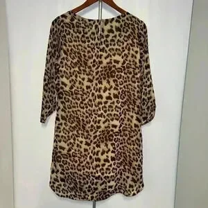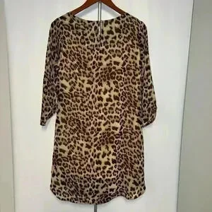 Pre-owned Charming Charlie leopard print dress, size M. The dress is made of 100% polyester with a 100% polyester lining. It features a boat neck, three-quarter sleeves, and a relaxed fit. The print is a classic brown and tan leopard pattern. Measurements are not provided. The dress appears to be in good condition with no visible imperfections. Made in China.