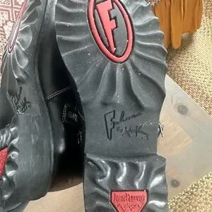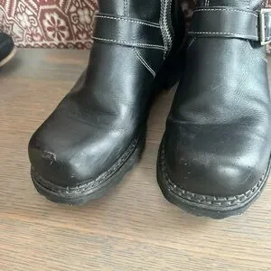 Stylish black leather boots. Double buckle detail. Durable and chic.