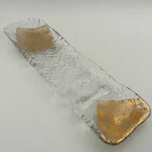 This sophisticated rectangular platter features elegant design elements for memorable presentation. Handmade in Japan, the chic texture of this platter is achieved by molding the glass against naturally occurring stone. The gold leaf is applied by hand, so each piece is unique. The gold leaf is embedded in the glass, so unlike conventional gold leaf and gold flake it will not fade or wash off. Equally well suited for Japanese and contemporary cuisines, this refined piece is sure to take your aesthetic experience to the next level. The textures and colors maximize sensory appeal for plating that is truly stunning.