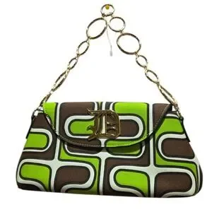 Artpop Bag from Dyspnea showcases a bold 60s-inspired geometric pattern in vibrant lime green, chocolate brown, and cream. This structured shoulder bag features a distinctive gold-tone chain strap with oversized circular links and a prominent Gothic 'D' logo hardware on the front flap. The textile exterior offers a unique tactile feel, while the flap closure ensures your essentials stay secure. Perfectly capturing a retro-futuristic aesthetic, it comes with its original matching patterned box, making it a standout accessory for any vintage-inspired or maximalist ensemble.