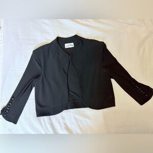 Black Bolero with three quarters sleeves, a built-up neckline, structured shoulders and decorative satin covered buttons.