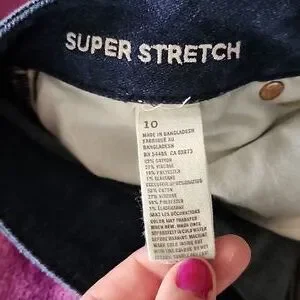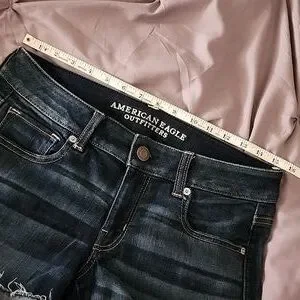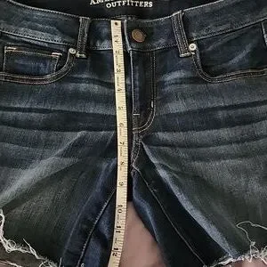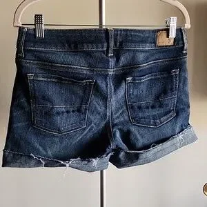 Classic, cute, dark wash, blue, "American Eagle Outfitters" denim jean, super stretch shorts. Size 10, and there are measurements in the photos as well. They have 5 functional pockets (3 in front and 2 in the back) and belt loops. Raw frayed hem for a casual look. Comfortable mid-rise fit. You can adjust the length as well by rolling them up. Like new! No flaws noticed. Comes from a smoke-free home. Please ask any questions before buying. Make an offer or bundle more than 1 of your likes from my closet for a discounted price! 😉