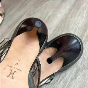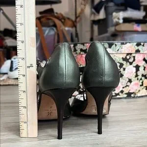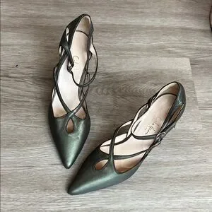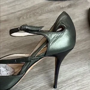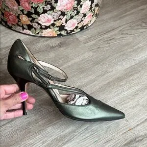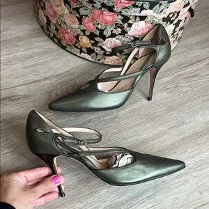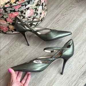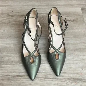 These gorgeous classic pointed-toe pumps have delicate crossed ankle straps with small silver-toned buckles, for secure closure (adjustable for a comfortable fit). Metallic green leather upper adds a subtle sheen and the sleek silhouette is perfect for dressy or professional looks. Very fine, delicate black leather piping is stitched along edges. See all photos.
