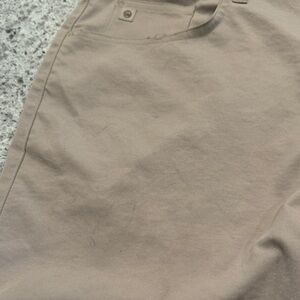 Soft stretch fabric for comfort. Classic five-pocket styling and subtle hardware. Neutral tan/khaki works with many outfits.