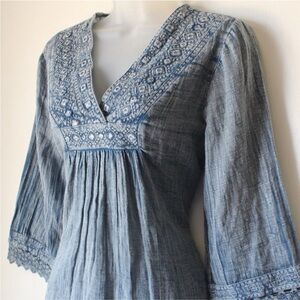 Chic denim blue tunic. Features delicate embroidery. Ideal for casual wear.