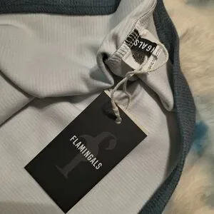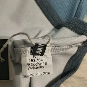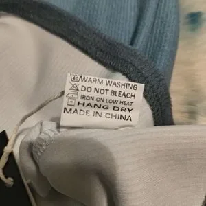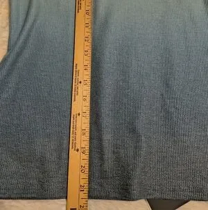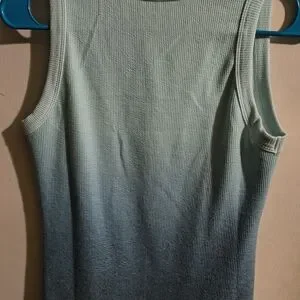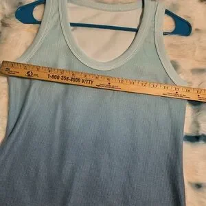 Light teal to navy ombre tank with a scoop neckline. Soft, lightweight knit for comfortable all-day wear. Sleeveless design makes it easy to layer or wear alone. Color: light teal fading to navy blue.