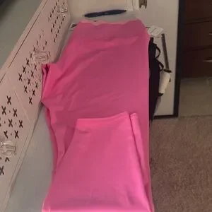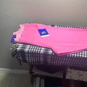 Pink leggings with a unique scalloped edge around waist. They are high rise and Capri length. They are made with moisture wicking fabric. Inseam measures 25 inches long. They are Sz XXL. Made of 78% nylon 22% spandex. NWT