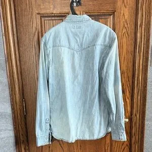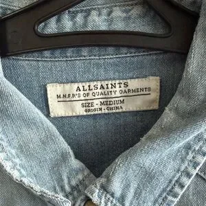 Classic All Saints denim shirt in light blue. Snap button front and western-style chest pockets. Long sleeves with button cuffs. Soft worn-in denim feel. Easy casual layering piece.