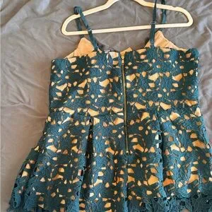 Stunning emerald lace dress. Features intricate overlay design. Ideal for elegant events.