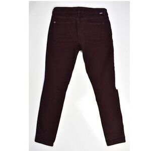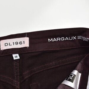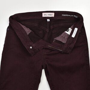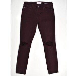 DL1961 Margaux Instasculpt Ankle Skinny jeans. Size 28. Burgundy, malbec color. Distressed at knees. Button and zip fly. Soft, stretch material.