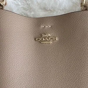 Structured Coach bucket bag in durable pebble leather with gold-tone hardware and signature logo detail. Features an adjustable strap for shoulder or crossbody wear and a subtle red interior lining for a refined pop of color.