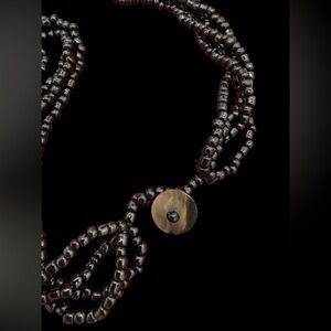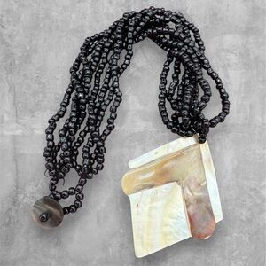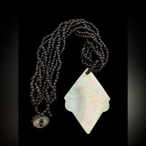 Boho beach chic abalone diamond shaped pendant necklace with 4 strands of large seed beads. Secured with a shell button. Hand-crafted. Perfect for your next tropical vacation. In great condition, the shell has natural imperfections. Please see the video and photos. 16”; Pendant 2.75” x 2”.