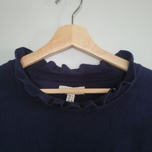 Designed with a soft knit body, ruffled neckline, and ruffled cuffs for a romantic, feminine look.