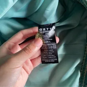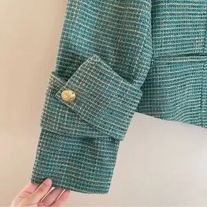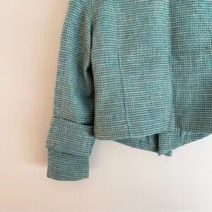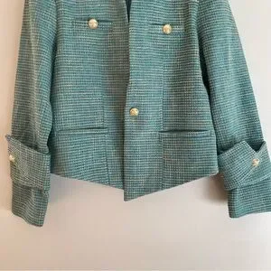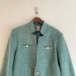 Tailored sport coat in mint green tweed. Gold-tone buttons add polished contrast. Structured shoulders and notchless collar. Elegant textured weave for refined style.