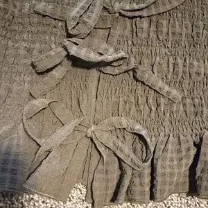 Smocked sleeveless camisole with front tie closures. Ruffled trim along the neckline and hem. Textured lightweight fabric for easy layering. Casual, feminine silhouette.