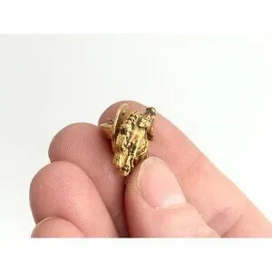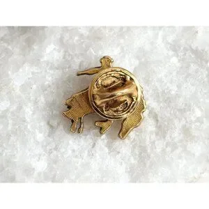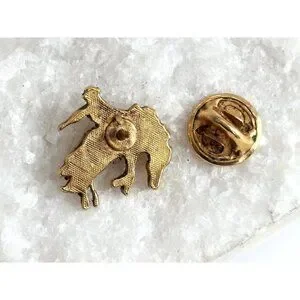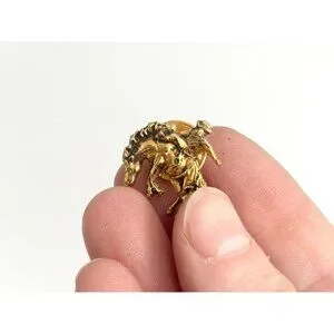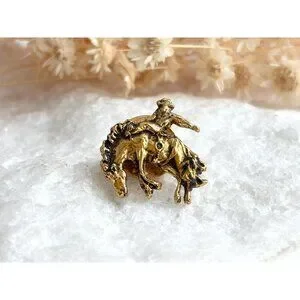 Adorable little gold toned bucking bronco cowboy on a horse. The brooch enclosure is via a push back pin. Dark gold toned piece. Lovely realistic detailing.
