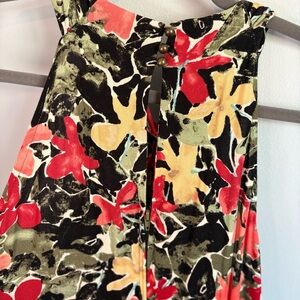 Sleeveless high necked maxi with striking floral pattern. Features vivid red and black with green accents. Soft drape and flowing silhouette. Versatile for day or evening wear. Perfect for a beach vacation!