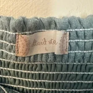 Lightweight smocked top in a sage green tone. Elasticized shirred bands provide stretch. Simple neckline for easy layering. Had a small snag. It’s pictured.