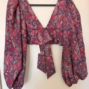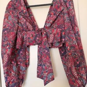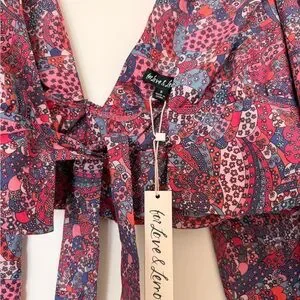 For Love & Lemons paisley crop top with long sleeves. Deep V neckline and front tie detail. Ruffled hem and flowing silhouette. Lightweight, printed fabric with vibrant colors.